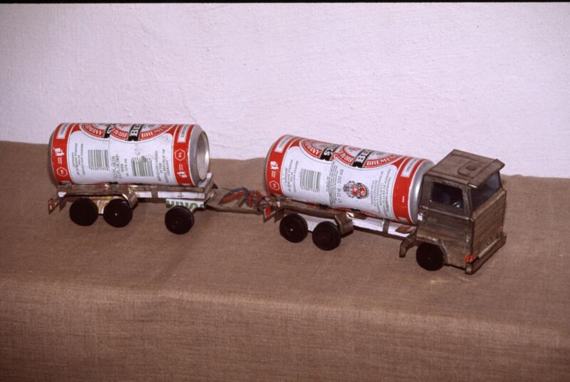 Rund 300 Objekte und zahlreiche Fotos zeigen die grenzenlose Kreativität von Kindern, die in einem schwierigen sozialen Umfeld leben und heranwachsen, wo gekauftes Kinderspielzeug nicht die Selbstverständlichkeit ist. Aus Blech, Draht und Materialien aus der Natur entstehen selbst gemachte Autos, Motorräder, Schiffe und Flugzeuge. Aus Ölsardinendosen werden Cabrios, aus Raphia Kipplader, aus Holz Roller – sogar mit Bremse zum Lastentransport. Aber auch die Einflüsse aus ihrer Umwelt – sei es der Straßenbau, Tourismus, Krieg und Gewalt – spiegeln sich in ihren Kunstwerken. Fritz und Ilse Trupp haben diese Objekte jahrzehntelang in Afrika, Asien und Südamerika gesammelt und zeigen sie aktuell im Schmiding.