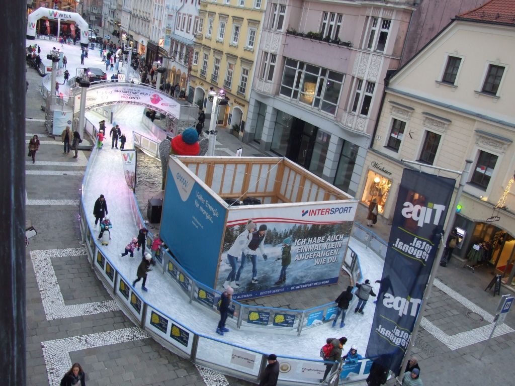 Eislaufen auf einer 800 Quadratmeter großen und glitzernden Echt-Eisfläche - täglich am Welser Stadtplatz. Und für alle, die sich ganz spontan auf das Glatteis führen lassen möchten, steht in der Panoramahütte mit Sonnenterrasse der praktische Schlittschuhverleih zur Verfügung.