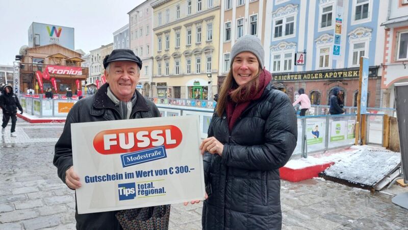 Eine leckere Mehlspeise für sich und seine Frau Annemarie hatte sich Walter Engelbogen gerade im nahe gelegenen Kaffeehaus geholt, als ihn am Welser Stadtplatz die zwei Redakteurinnen Ingrid Oberndorfer und Gertrude Paltinger erwischten und nach seiner Lieblingszeitung befragten. Mit der richtigen Antwort „Tips“ ist der 80-Jährige somit der erste Welser Gewinner der heurigen Glücksengerl-Aktion. Er darf sich jetzt über einen 300-Euro-Gutschein von der Fussl Modestraße freuen.