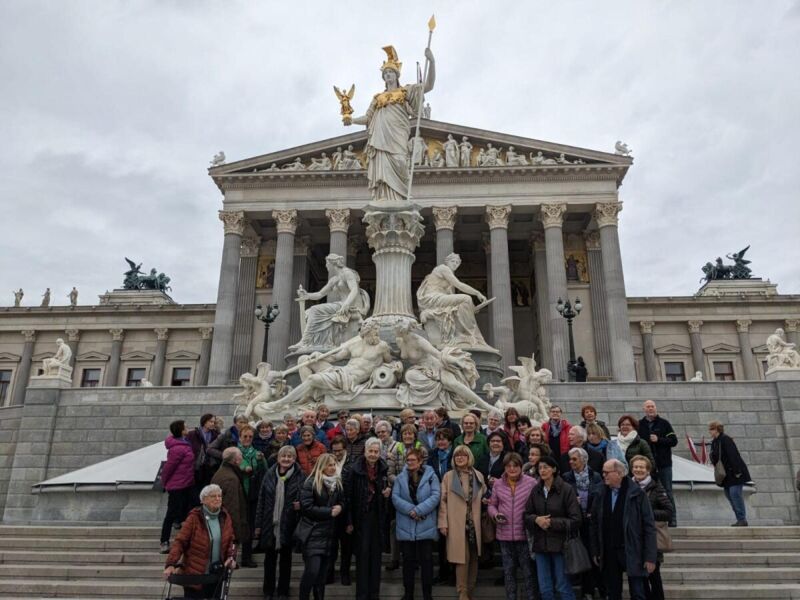 Die 62 Teilnehmer wurden vor dem Parlament von der Welser Bundesrätin Alexandra Platzer empfangen. Nach der strengen Sicherheitskontrolle wurde die Gruppe vom Steyrer Bundesrat Franz Ebner begrüßt und startete eine Tour durch das historische Bauwerk an der Ringstraße. Bei der Führung bestaunte die Gruppe die großartige Architektur des Gebäudes und die Spitzenleistungen österreichischer Bau- und Handwerkskunst bei der Sanierung des Gebäudes. Anschließend traf sich die Gruppe im Parlamentscafé zu Gesprächen mit Nationalrat Laurenz Pöttinger aus Grieskirchen.Den Abschluss der Wienfahrt bildete natürlich ein Heurigenbesuch, wo ein Musikant für gute Stimmung sorgte.