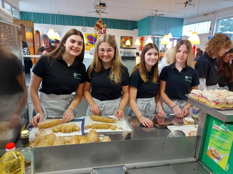 Im Rahmen des Projektes kochten die Lambacher Schülerinnen mit ihren Lehrkräften aus „Resten“ ein hochwertiges Menü und schenkten es persönlich an die Besucher der Welser Tafel, Menschen mit sehr geringem Einkommen, aus.