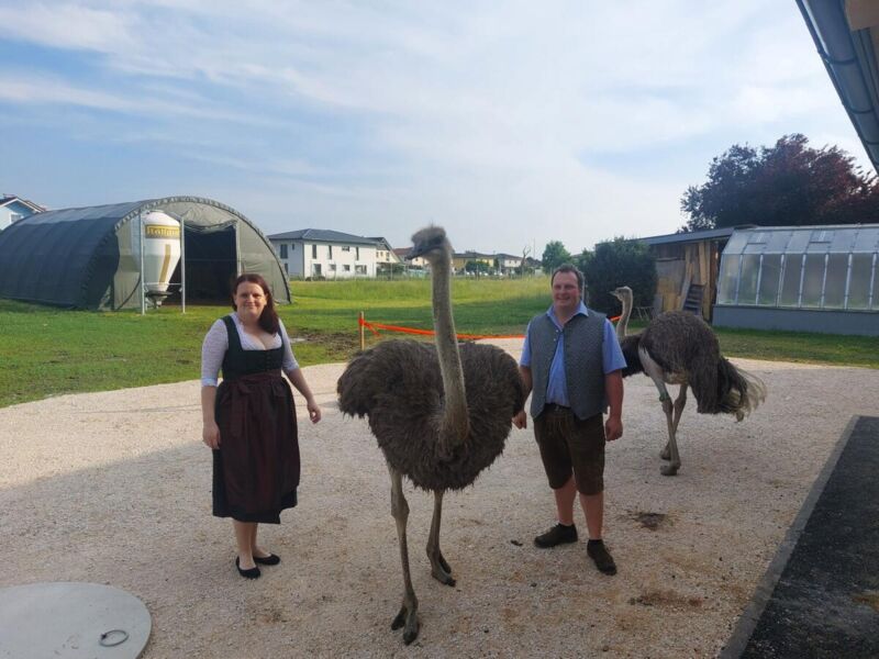 2019 eröffnete das Wirtshaus „Zum Reihofer“ wieder. Die jungen Wirtsleute begannen mit Ziegen in einem Streichelzoo für die Kinder. Irgendwie kamen dann aber schnell drei Sträuße dazu: „Stammgäste sprachen darüber, wie gut das Fleisch ist“, erinnert sich die gelernte Tierpflegerin und Köchin Michaela Schimek. Also probierte man Straußenfleisch und es begann die nächste Episode im Wirtshaus. Sie starteten ihre Straußenzucht. In vielen Gesprächen mit einem Züchter aus Taufkirchen/Trattnach holten sie sich Hilfe und nun ist eben der Strauß los beim Reihofer. „Es gab viel zu lernen“, sagt der gelernte Elektriker Eschlböck-Bauer.