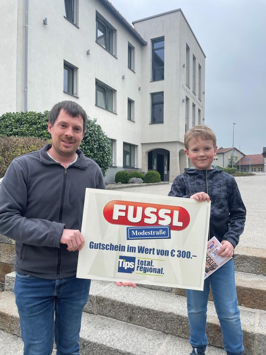 Daran, dass Maximilian vielleicht zwei Minuten zu spät in den Gitarrenunterricht gekommen ist, ist das Tips-Glücksengerl schuld. Denn Tips-Redakteurin Ingrid Oberndorfer hielt das Vater-Sohn-Gespann mit der Frage nach deren Lieblingszeitung auf. Nach kurzer Rücksprache mit Maximilian gab Papa Stefan dann mit „Tips“ die richtige Antwort und durfte so für den Achtjährigen einen 300 Euro-Gutschein der Fussl-Modestraße entgegennehmen.