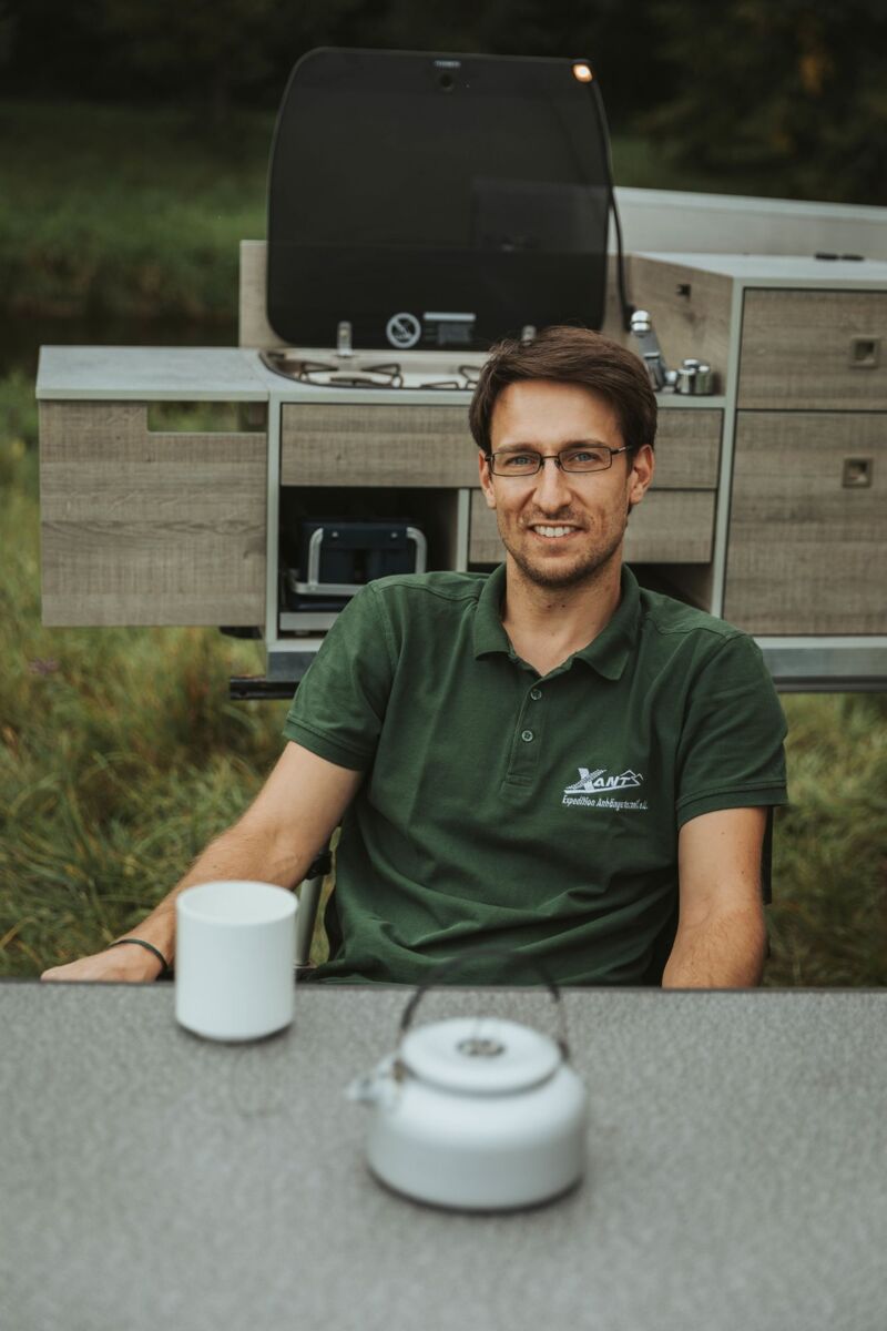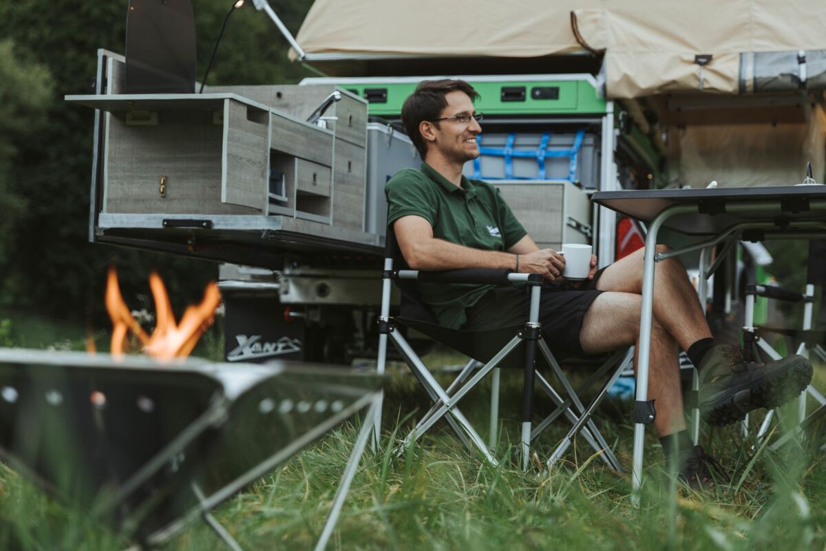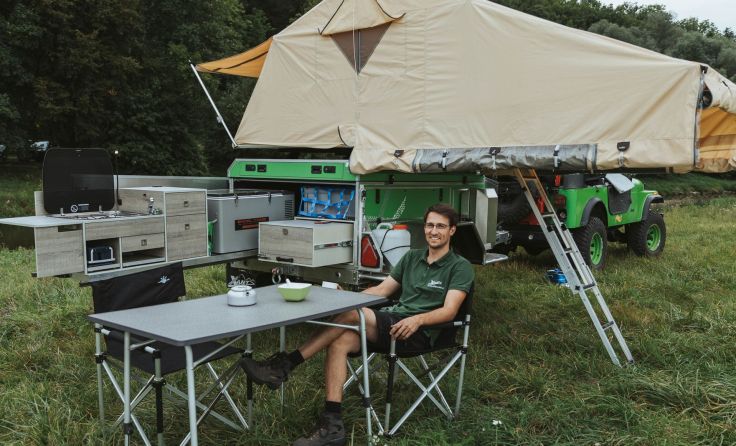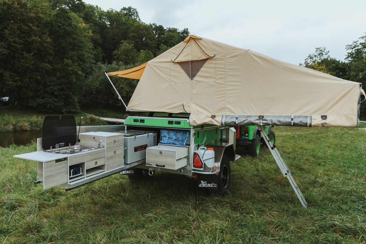 Der Anhänger ist fast zur Gänze aus Aluminium gebaut, der robuste Rahmen ist ausgelegt für die Verwendung im Gelände. Die Auswahl der Materialien erfolgte nach den Aspekten des Leichtbaus und der Korrosionsprävention. Komponenten aus dem Motorsport und Geländereifen garantieren Fahrkomfort im Gelände und Sicherheit auf der Straße. Die Luftfederung kann sogar per mobiler App gesteuert werden. Die Offroad-Kupplung ist einzigartig in Europa mit Straßenzulassung. Der Innenausbau wurde gemeinsam mit einer oberösterreichischen Tischlerei umgesetzt: „Der Anhänger verfügt über einen Kochbereich mit Kühlschrank, einen Gasdurchlauferhitzer, einen 80-Liter-Wassertank, viel Stauraum und ein Schlafzelt“, erklärt der Konstrukteur und Erbauer, wie sein Anhänger ausgestattet ist.