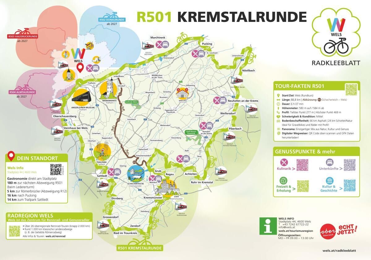 Am Minoritenplatz warten Rad-Service, Geocaching-Angebote sowie Neuheiten rund um das Rad auf die Gäste. Die Strecke führt über Güterwege und Schotter von Wels über Sattledt - dort findet die Eröffnung des Trailparks statt - Kremsmünster nach Neuhofen und über Pucking wieder retour. 17 Gemeinden sind eingebunden. Es muss nicht alles in einer Tagesfahrt erledigt werden. Die neuen Routen sprechen Sportbegeisterte, Familien und Alltagsradler gleichermaßen an und eröffnen vielfältige Möglichkeiten, die Region aktiv zu entdecken. Das freut naturgemäß auch die Touristiker, die hier ein perfektes Angebot für die Gäste sehen. „Radtourismus wird in Oberösterreich immer beliebter. Mit dem Radkleeblatt schaffen wir ein zusätzliches Angebot für die Gäste“, erklärt VP-Landesrat Markus Achleitner.