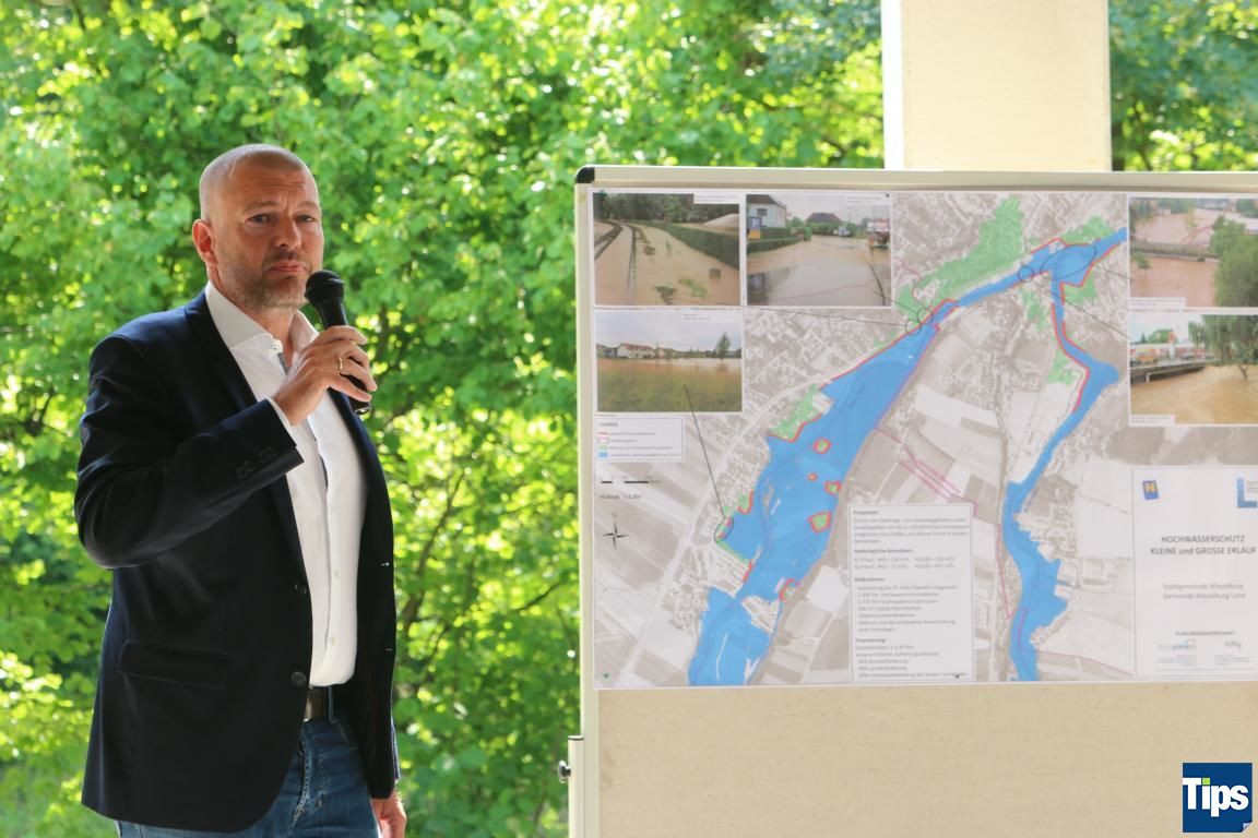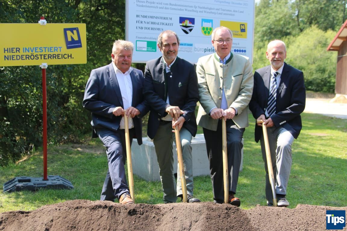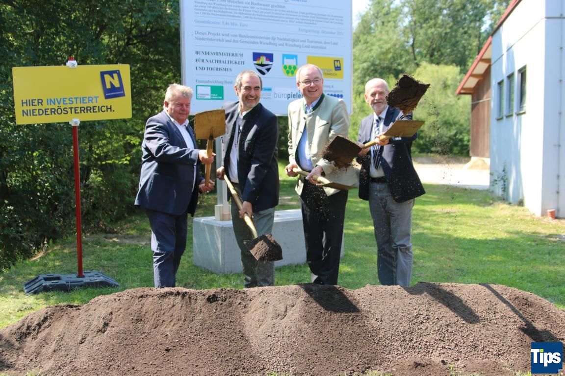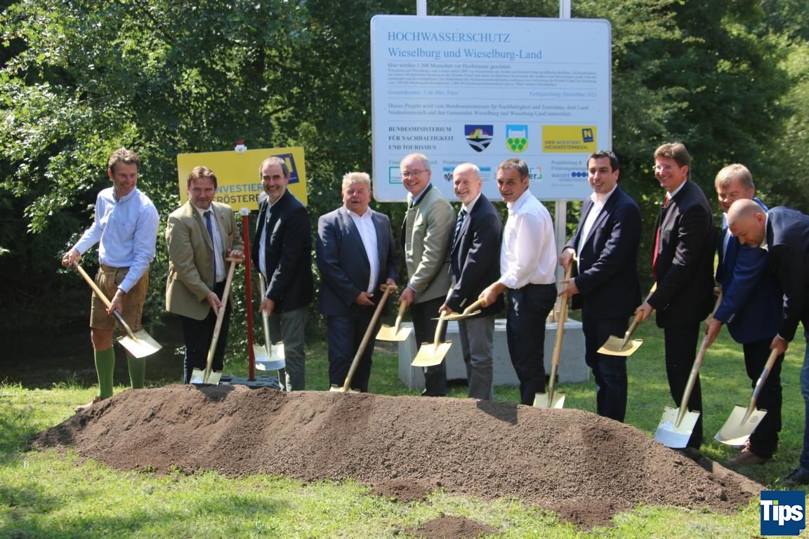 WIESELBURG STADT/LAND. Heute fand am Messegelände der Spatenstich zum Bau des Hochwasserschutzes in der Region statt. Nachdem 2009 überfluteten die Hochwässer der Kleinen und Großen Erlauf Teile der Stadt- und Landgemeinde. Die Arbeiten des Hochwasserschutzprojektes umfassen eine Aufweitung der Kleinen Erlauf, die Errichtung von 1.300 Laufmetern Hochwasserschutzdämmen, 2.400 Laufmetern Hochwasserschutzmauern und rund 300m² mobile Dammbalken. Das Projekt soll im Dezember 2021 fertiggestellt sein. Gesamtkosten: 5,46 Millionen Euro.