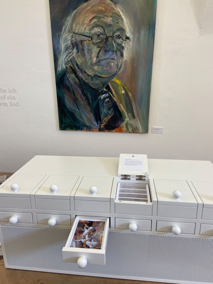 Mit Abt Reinhold Dessl wurden in der Stiftskirche dazu passende Engelbilder ausgesucht und die darunterliegenden sechs Laden der Box mit diesen Fotos in unterschiedlicher Reihenfolge zu den Musikausschnitten befüllt. “Balduins Box“ wird bis zu ihrem ersten Auftritt bei den „Wilheringer Notenköpfen – Balduin Sulzer quergehört 2021“ ihren Platz auf dem Komponiertisch im Balduin-Sulzer-Raum des neuen Stiftsmuseums finden.