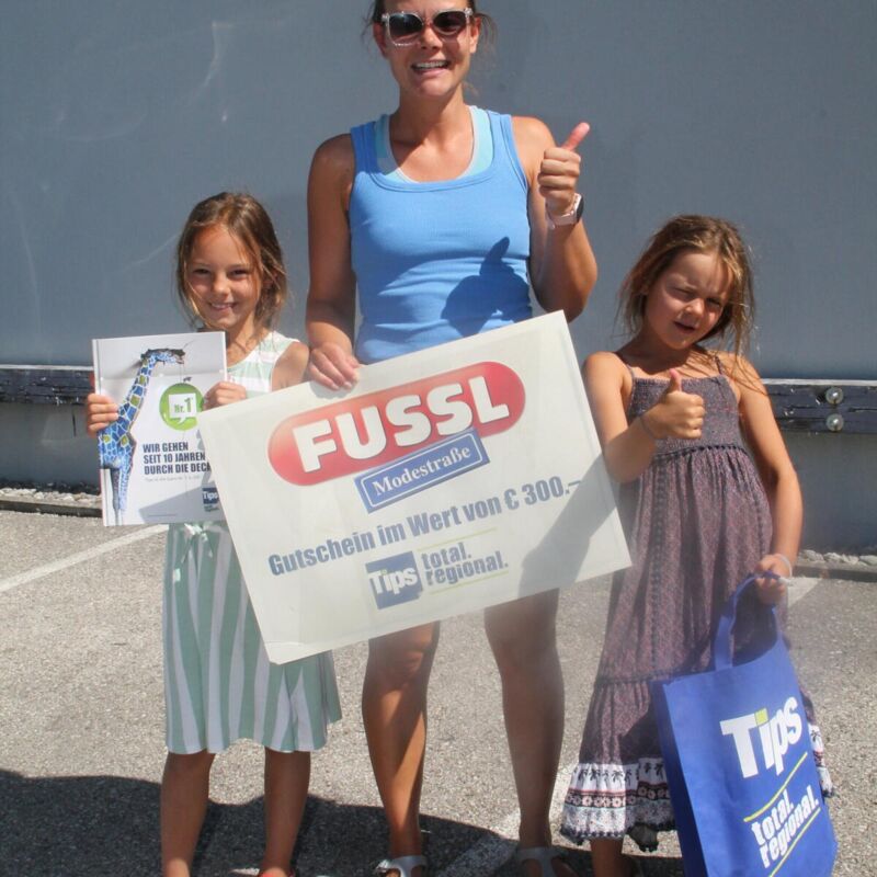 Am Parkplatz eines Büroartikelgroßmarktes in der Marktgemeinde Sonntagberg traf Tips-Redakteurin Karin Novak auf Zweifachmama Lisa Aigner und ihr beiden Töchter Helene (8 Jahre) und Rosmarie (bald 7 Jahre). Auf die Frage, ob sie eine regionale Lieblingszeitung habe, die gratis in die Haushalte kommt, hatte die gelernte Optikerin die richtige Antwort parat: „Die Tips blättere ich immer durch.“ Und schon war die Allhartsbergerin um einen Fussl-Modegutschein im Wert von 300 Euro reicher. „So eine Überraschung!“, freute sich die 40-Jährige. „Ich gehe ja von Herzen gerne shoppen. Da ist der Gutschein wie für mich gemacht“, lachte sie. „So ein Glück, dass wir gestern vom Camping-Urlaub nach Hause gekommen sind“, freute sich Tochter Helene mit ihrer Mama mit. „Wir waren fünf Tag in Mooslandl“, plauderte Rosmarie aus dem Nähkästchen. „Und außerdem waren wir heuer auch schon in Kroatien, auf der Insel Krk.“ Ob die Mädels zum Shoppen mitdürfen, hat Mama Lisa aber offen gelassen. „Mal schauen, gewonnen habe schließlich ich“, lachte sie.