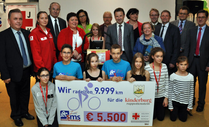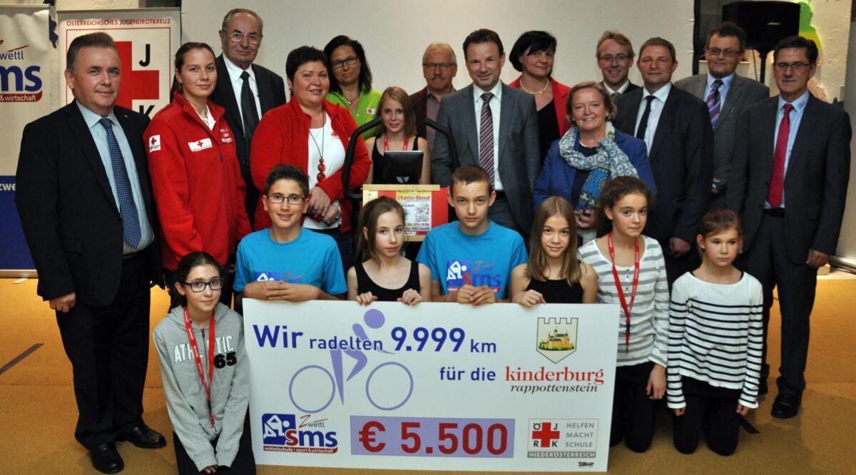 Ein Höhepunkt an diesem Abend war die Aktion „Radeln für den guten Zweck“. Denn die Schüler der 1. NÖ Ergometerschule, der Mittelschule für Sport und Wirtschaft Zwettl, treten seit der „Kick-Off“ Veranstaltung vor genau einem Jahr fleißig in die Pedale, insgesamt wurden so knapp 10.000 Kilometer zurückgelegt. Dank der Spenden zahlreicher lokaler Firmen, die quasi „Kilometergeld“ zahlten, konnte nun die stolze Summe von 5.500 Euro an die Kinderburg Rappottenstein übergeben werden. Erfreulicher Aspekt am Rande: Für dieses humanitäre Projekt wurde die Schule vom Österreichischen Jugendrotkreuz mit dem Henry-Award ausgezeichnet.
