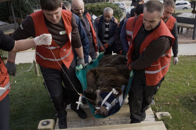 Nachdem das Vier Pfoten-Team Mark betäubt und aus seinem Käfig befreit hatte, untersuchte ihn die begleitende österreichische Tierärztin Julia Bohner und stellte sicher, dass er reisefähig ist. Nun ist Mark auf dem Weg von Albanien über Nordmazedonien, Griechenland, Bulgarien, Rumänien und Ungarn nach Österreich. Mark war über 20 Jahre lang als Touristenattraktion neben einem Restaurant in Tirana gehalten worden. In einem kleinen Käfig mit Betonboden konnte er kein natürliches Verhalten ausleben. In seinem viel zu kleinen Käfig fand Mark kaum Schutz vor Hitze oder Schlechtwetter. Ohne Rückzugsort war er ständig den Blicken der Restaurantbesucher ausgesetzt. Auch Winterruhe konnte er nie halten. Er braucht dringend artgemäße Pflege.
