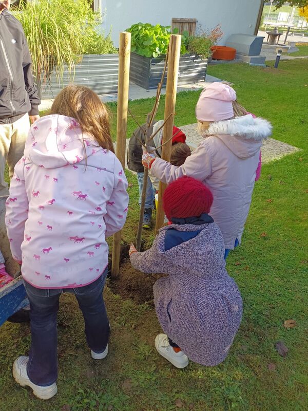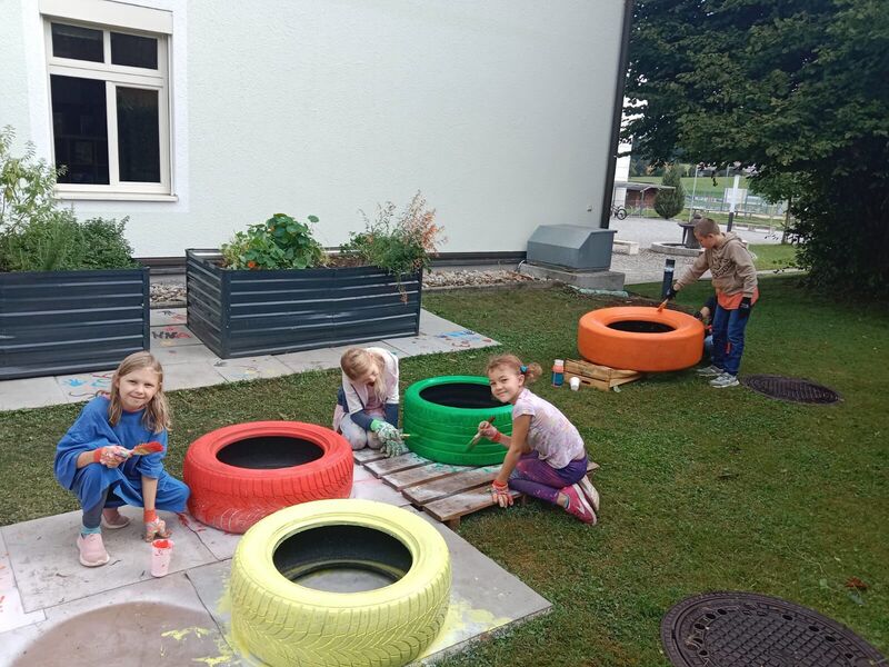 Mit unserem Projekt „Grünes Klassenzimmer“ hat die 3a der VS Eggelsberg einen nachhaltigen Lern- und Lebensraum geschaffen, der Klimaschutz, Inklusion und Lernen mit allen Sinnen verbindet. Aus einer zuvor ungenutzten Fläche entstand in Zusammenarbeit mit Kindern, Eltern und den Bauhof-Team ein Garten, in dem Bildung sichtbar wächst. Die Kinder bauten sechs Hochbeete selbstständig auf, installierten eine Regentonne, errichteten einen Komposter, setzten Beerensträucher und gestalteten die Beete aus upgecycelten Reifen. Ein gepflanzter Klassenbaum trägt eine besondere Botschaft: Er wächst mit uns – so wie jedes Kind.