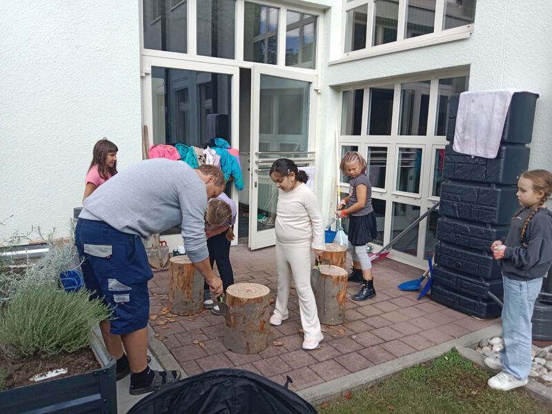 Ein Sitzkreis aus Baumstämmen und bunte Upcycling-Beete schaffen eine naturnahe Lernumgebung. Die Kinder planten den Garten selbst: Sie maßen Flächen, zeichneten Pläne, wählten Pflanzen aus und übernahmen Pflege, Dokumentation und Ernte.