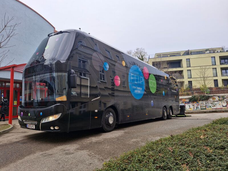 Eine der Stationen war auch der Flip2Go Finanzbus, an dem interaktiv der Umgang mit Geld ausprobiert werden konnte (WerteKoffer, WeltReise, AusgabenCheck, Job-O-Mat, MarktHandel, FinanzDuell, GeldLabyrinth).