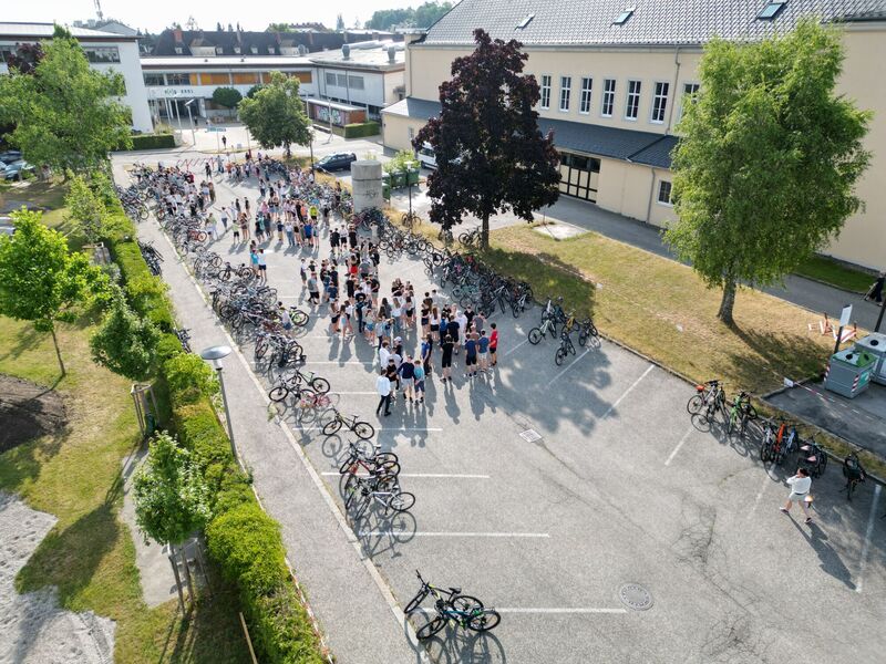 Seit mittlerweile 4 Jahren steht der Donnerstag in der letzte Schulwoche vor den Sommerferien am BRG Enns im Zeichen der klimafreundlichen Mobilität. Die gesamte Schulgemeinschaft ist eingeladen, den Schulweg mit dem Fahrrad oder Roller zu bestreiten und der Parkplatz vor der Schule wird für den Autoverkehr gesperrt. Dadurch steht er - statt für den Stau der Eltern-Taxis - als zusätzlicher Fahrrad-Parkplatz zur Verfügung, was für die in Summe mehr als 250 Fahrräder und Roller auch nötig ist. An diesem Tag nutzen nämlich nicht nur die in der Nähe wohnenden Schüler*innen und Lehrpersonen ihre Zweiräder, sondern auch die aus dem weiteren Umkreis radeln bis zu 45 Minuten in die Schule. Der Fahrrad-Aktionstag 2023 wurde auch von der Gemeine Enns mit der Drohne begleitet, wobei das folgende Foto entstanden ist.