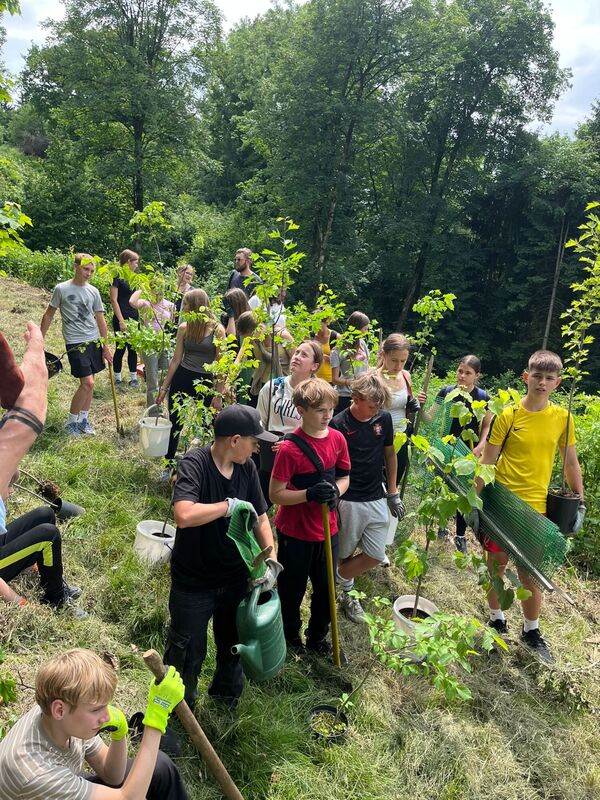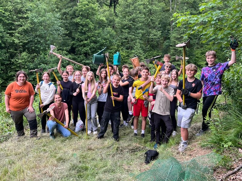 Daher kümmerte sich die Klasse nach dem Einsetzen ihrer eigenen Bäume auch um die bereits bestehenden Jungbäume. Das Gelände war stark zugewachsen: Brombeeren, Sträucher und hohes Gras nahmen den jungen Bäumen Licht und Platz. Mit viel Einsatz und teilweise neuem Werkzeug wie Axt oder Wiedehopfhacke in der Hand wurden die Pflanzen wieder freigeschnitten. Auch wenn die Dornen pieksten, die Brennnesseln brannten und alle ordentlich ins Schwitzen kamen, war die Motivation durchgehend groß. Die Klasse ließ sich vom körperlichen Einsatz nicht bremsen.