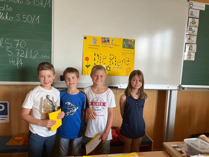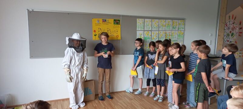 Wir, die zweite Klasse, haben uns im Sachunterricht über mehrere Wochen mit der „Honigbiene“ beschäftigt. In sechs Gruppen arbeiteten wir verschiedene Themen, wie zb. den Körperbau der Biene, die Aufgaben der Biene und wie können wir Bienen schützen, zur Honigbiene aus. Für die Informationsbeschaffung haben wir mit den Tablets gearbeitet. Es entstanden tolle Plakate und sehr informative Präsentationen. Diese vorbereiteten Vorträge präsentierten wir den anderen Klassen. Während der Durchführung des Projektes, konnten wir auch echte Honigwaben begutachten. Außerdem hatten wir an einem Tag ein „Honigsüßes Frühstück“. Es gab mehrere Sorten Honig zum Verkosten, welche vom ortseigenen Imker zur Verfügung gestellt wurden. Als Abschluss zu unserem Bienenprojekt führte uns unser Wandertag, gemeinsam mit anderen Klassen, nach Zwettl an der Rodl ins Bienenmuseum und zum Bienenwanderweg. Im Bienenmuseum erfuhren wir wie eine Biene lebt, was sie den ganzen Tag macht und warum sie so wichtig ist und wie wir sie schützen können. Unser bereits vorhandenes Wissen kam uns dabei zu Gute!