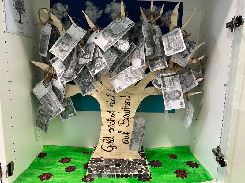 Somit möchte unser Kunstwerk durch die paradoxe Ausführung zum Nachdenken anregen, was dieser Spruch bedeuten könnte und wie jeder für sich einen geeigneten Umgang mit Geld finden kann, denn: Geld wächst tatsächlich nicht auf Bäumen! Unser Kunststück steht in einer Vitrine in der Schule, für welche ein Unter- sowie Hintergrund gestaltet wurde. ·
