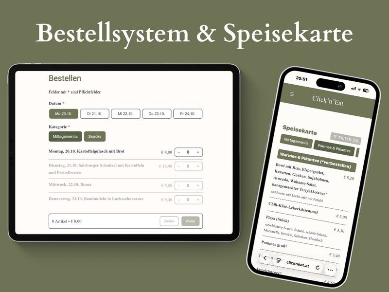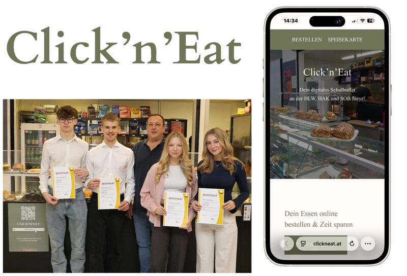 Click’n’Eat ist die offizielle Schulbuffet-Website der HLW, HAK und SOB Steyr. Sie bündelt eine wöchentlich aktualisierte Speisekarte mit klaren Preisen, eine bequeme Online-Vorbestellung von Menüs und eine direkte Feedback-Möglichkeit. Schüler:innen bestellen jederzeit – egal wo – über clickneat.at und holen ihre Speisen zur Wunschzeit entspannt am Buffet ab. So bleibt die Pause stressfrei.