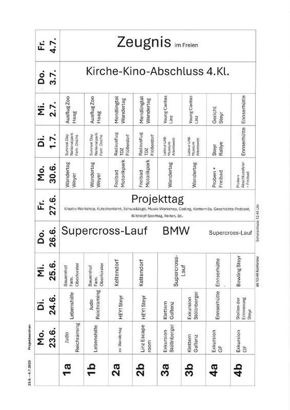 Um Kosten zu sparen und die Bauzeit zu verkürzen, wurde in den letzten beiden Schulwochen des vergangenen Schuljahres projektorientierter Unterricht ohne Schulgebäude durchgeführt. Aus der beigefügten Übersicht ist ersichtlich, wie umfangreich und vielfältig das Angebot war. Es reichte von einem zweitägigen Wandertag mit Nächtigung auf der Ennserhütte und dem Aufstieg auf den Almkogel zum Sonnenaufgang über einen Ausflug mit Wildbiologen bis hin zu Exkursionen ins Labour LAP, zum Bezirksgericht Steyr, zur Young Caritas, zur Lebenshilfe Großraming sowie zu regionalen Betrieben wie GF und Stöllnberger. Besonders hervorzuheben sind außerdem der Supercross-Lauf sowie der Geschichte-Podcast mit einem Großraminger Zeitzeugen.