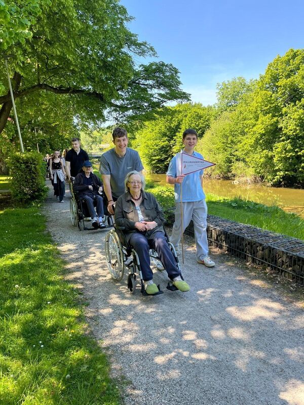Am 14. Mai 2025 war es endlich so weit: Der Rollwandertag – organisiert von den Teilnehmer:innen des Wahlpflichtfaches Soziale Orientierung – fand statt. Schüler:innen der 6. und 7. Klassen schoben Bewohner:innen des Alten- und Pflegeheims FraDomo im Rollstuhl durch Vöcklabruck. Bei sonnigem Wetter genossen sie den Spaziergang entlang der Vöckla und über den Stadtplatz. Anfängliche Scheu und Unsicherheiten waren bald überwunden und die gemeinsame Zeit wurde mit Kennenlernen und Plaudern verbracht: über den letzten Urlaub, Kindheitserinnerungen oder die Schule. Am Ende des Spaziergangs ließen die fast 140 Teilnehmer:innen den Rollwandertag gemütlich im Garten des Mutterhauses ausklingen, wo alle mit Getränken und Eis versorgt wurden. Der Rollwandertag war eine Bereicherung für Jung und Alt – wir freuen uns auf eine Wiederholung im nächsten Jahr!