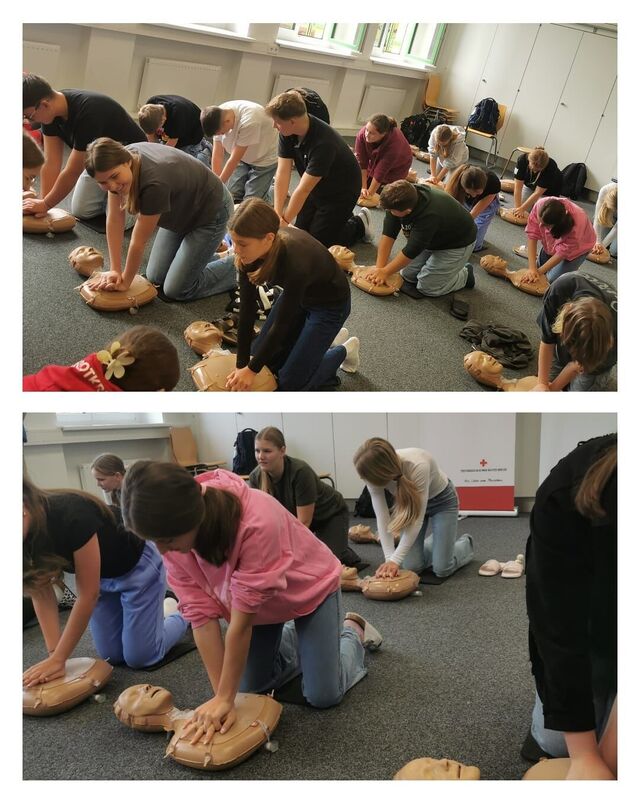 Bereits ab Schulbeginn widmen wir uns im Rahmen des Projekts „Schüler retten Leben“ intensiv dem Thema Herz-Kreislauf-Stillstand und der richtigen Reaktion im Ernstfall. Im Biologieunterricht wird medizinisches Grundwissen altersgerecht vermittelt, während im Sportunterricht die praktische Umsetzung im Mittelpunkt steht – eine perfekte Verbindung von Wissensvermittlung, Bewegung und Handlungskompetenz.