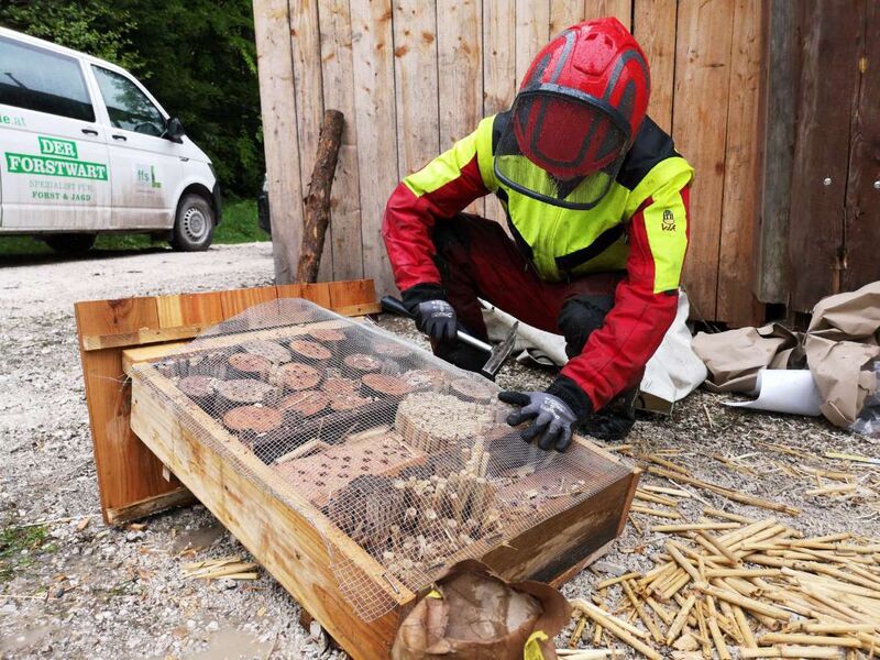 Um Wildbienen geeignete Nisthilfen bereitzustellen, haben die Schüler und Schülerinnen der Forstfachschule Traunkirchen Insektenhotels gebaut. Um auch das richtige Nahrungsangebot zur Verfügung zu stellen, wurden ca. 100 Wildsträucher als Bienennahrung gepflanzt. Das Projekt wurde mit dem Naturschutzbund und den Österreichischen Bundesforsten realisiert. Fachkundige Anleitung und alles was man rund um Bienen und Blumen wissen muss, gab es von einem Wildbienenexperten.