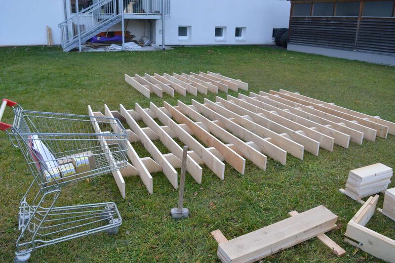Das Material: Ca. 180 Meter Schalungsbretter 1 Silofolie (12m x 25m) 60 Holzdreiecke 8 Eisenwinkel unzählige Schrauben.