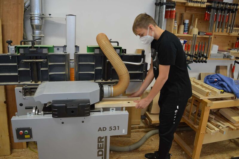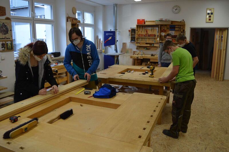 Sämtliche Bretter mussten auf die richtige Länge und Breite zugeschnitten werden. Um ein Umfallen der Bretter zu verhindern, war das Anfertigen von 60 schrägen Holzklötzen notwendig. Bevor die Holzdreiecke mit den Brettern verschraubt werden konnten, wurde jedes Loch für die Schrauben vorgebohrt und ausgefräst. Zusätzlich zu diesen Arbeiten, die sich oft bis weit in den Nachmittag hinein erstreckten und für welche einige Schüler freiwillig länger in der Schule blieben, musste für die Sicherheit der Schülerinnen und Schüler ein 60 Meter langer Fallschutz mit abgerundeten Kanten geschnitten werden. Die gebauten Wandstücke mit einer Gesamtlänge von 60 Metern werden zu einem 10 Meter x 20 Meter großem Viereck vor der Schule verschraubt. Dieser Schritt wurde bereits vollzogen. Die nachfolgenden Schritte finden in den kommenden Wochen statt. Der finale Aufbau der Eisbahn kann jedoch erst erfolgen, wenn die Temperaturen weiter absinken. Eine Silofolie mit einer Größe von 12 Meter x 25 Meter wird über das Viereck gelegt. Auf den Innenseiten der Wandstücke befindet sich die Silofolie, die durch eine nun angebrachte 60 Meter lange Innenholzverschalung einen wirksamen Schutz vor den scharfen Schlittschuhkufen erhält. Als letzter Schritt erfolgt das Montieren der Fallschutzbretter, die über abgerundete Kanten verfügen. Das nun entstandene Becken wird über mehrere Stunden mit Wasser geflutet. In den nachfolgenden kalten Tagen friert das Wasser zu Eis. Damit auch gewährleistet werden kann, dass alle Schülerinnen und Schüler in den Genuss der Eisfläche kommen, verfügt die Schule über 25 Schlittschuhe und mehrere Eishockeyschläger.