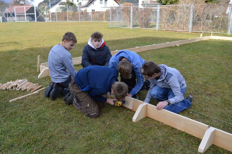 Unter dem Aspekt der Nachhaltigkeit sollte die Eisfläche für mehrere Winter umsetzbar sein, weshalb sie so konzipiert werden musste, dass diese wie ein Bausatz auf und wieder abgebaut werden kann. Die Umsetzung Wie wird eine auf- und wiederabbaubare Eisfläche konstruiert? In Kanada, dem Land des Eishockeys, werden häufig so genannten die Backyard Ice Rinks gebaut. Nach ausgiebiger Internetrecherche stand fest, dass die Schuleisfläche ähnlich wie die kanadischen Vorbilder konstruiert wird. Damit die Eisfläche auch Eishockeytauglich ist, sollte diese eine Größe von 200m² besitzen. Eine Eisfläche dieser Größenordnung benötigt nicht nur eine Menge Material, sondern auch hoch motivierte Schülerinnen und Schüler, welche handwerklich begabt und im Umgang mit dem Werkstoff Holz geschult sind. Die Arbeiten Mit Schalungbrettern wird ein Viereck mit einer Breite von 10 Metern und einer Länge von 20 Metern gebaut. Die Bretter für die Eislauffläche lieferte der Bauhof der Gemeinde Windischgarsten. Diese übernahm die anfallenden Kosten für das Holz. Insgesamt wurden über 180 Meter Holz verarbeitet. Die Schüler und Schülerinnen sowie die das Projekt betreuenden Lehrer hatten eine Menge Arbeit vor sich.