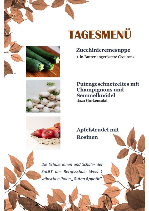 Worum ging es bei diesem Projekt? Es galt an zwei Standorten des Sozialen Wohnens Wels je ein Dreigängemenü für die BewohnerInnen bzw. TagesklientInnen vorzubereiten. Je Standort waren ca. 25 – 30 Personen zu verköstigen. Dazu war es vorerst nötig, zwei Menüs zusammenzustellen, Zutatenlisten zu schreiben und die benötigten Mengen zu berechnen. Außerdem war es den SchülerInnen wichtig, für ihre „Gäste“ ein entsprechendes Ambiente zu schaffen, denn das Augen isst ja bekanntlich mit. Daher wurden im Vorfeld auch passende Speise- und Tischkarten gestaltet und gedruckt.