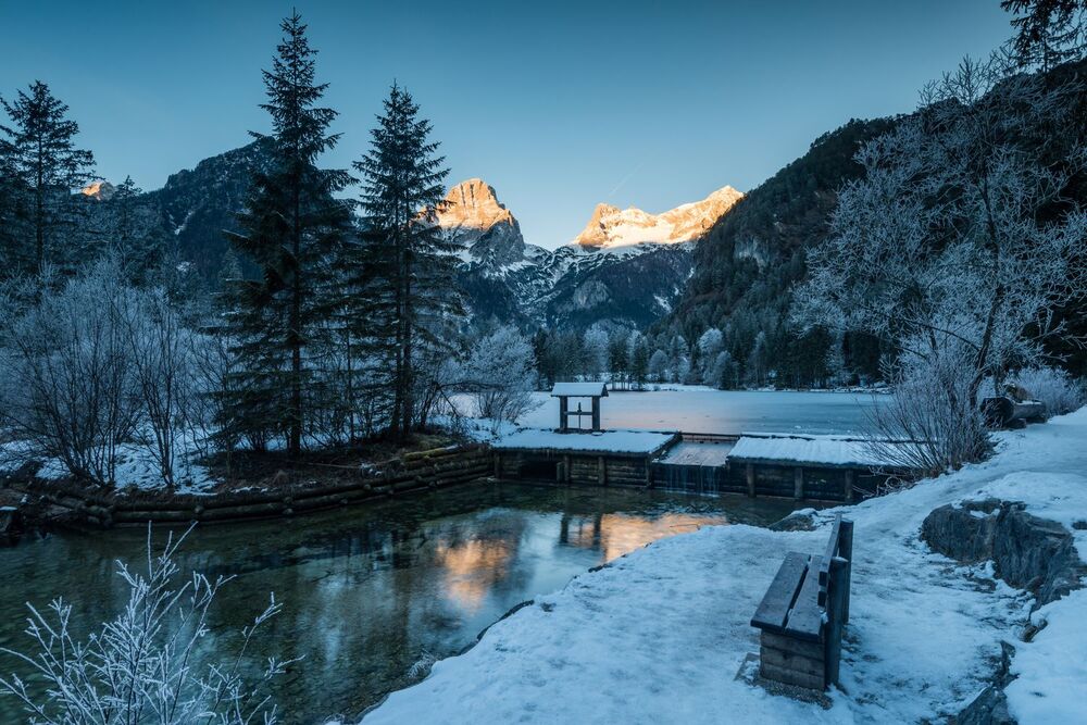 Morgens am Schiederweiher: die ersten Sonnstrahlen des Tages beleuchten die Spitzmauer und den Großen Priel