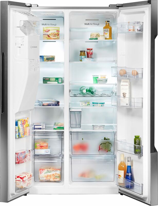 Die Sidy-By-Side Kühl-/Gefrierkombination Hisense RS694N4TC2 im Edelstahl-Look besticht mit ihrem großzügigen Gesamtnutzinhalt von 535 Litern und zahlreichen Funktionen. Das 368 Liter umfassende Kühlteil bietet mit vier Abstellflächen aus Sicherheitsglas und einer herausziehbaren Abstellfläche, zwei Gemüseschubladen sowie fünf Türfächern jede Menge Platz um Lebensmittel übersichtlich zu verstauen. Das 167 Liter umfasende Gefrierteil bietet fünf Abstellflächen, zwei Gefrierschubladen und drei Türfächer. Mit dem Eis-/Wasserspender kann man selbst wählen, ob man Eiswürfel, Crushed Ice oder gekühltes Wasser haben möchte. Durch den integrierten Wassertank im Inneren des Geräts ist keine Installation eines Festwasseranschlusses notwendig. Die Touch-Steuerung über ein Außen-LED-Display sorgt für eine bequeme Bedienung. Die No-Frost-Technologie und ein Multi Airflow-System regulieren die Temperatur im Inneren ganz automatisch. Die LED-Innenbeleuchtung leuchtet den kompletten Innenraum des Kühlschranks perfekt aus. Mit einem Stromverbrauch von 344 kWh im Jahr ist die RS694N4TC2 in die Energieeffizienzklasse A++ eingestuft.